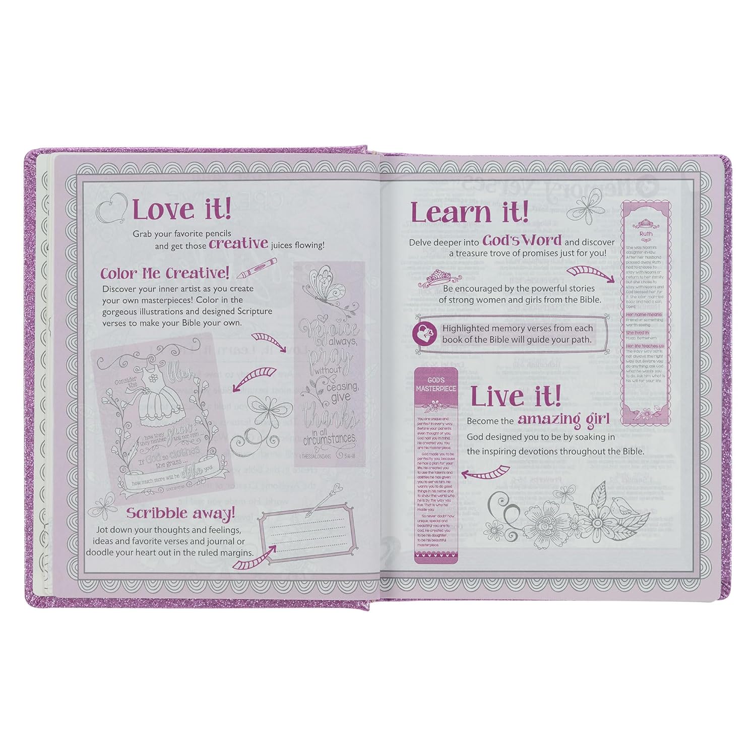 The Purple Glitter Hardcover My Creative Bible for Girls will inspire young ladies to delve deeper into the Word of God through devotions and Scripture. Help your daughter, granddaughter, niece, or princess find her worth in the Word of God.